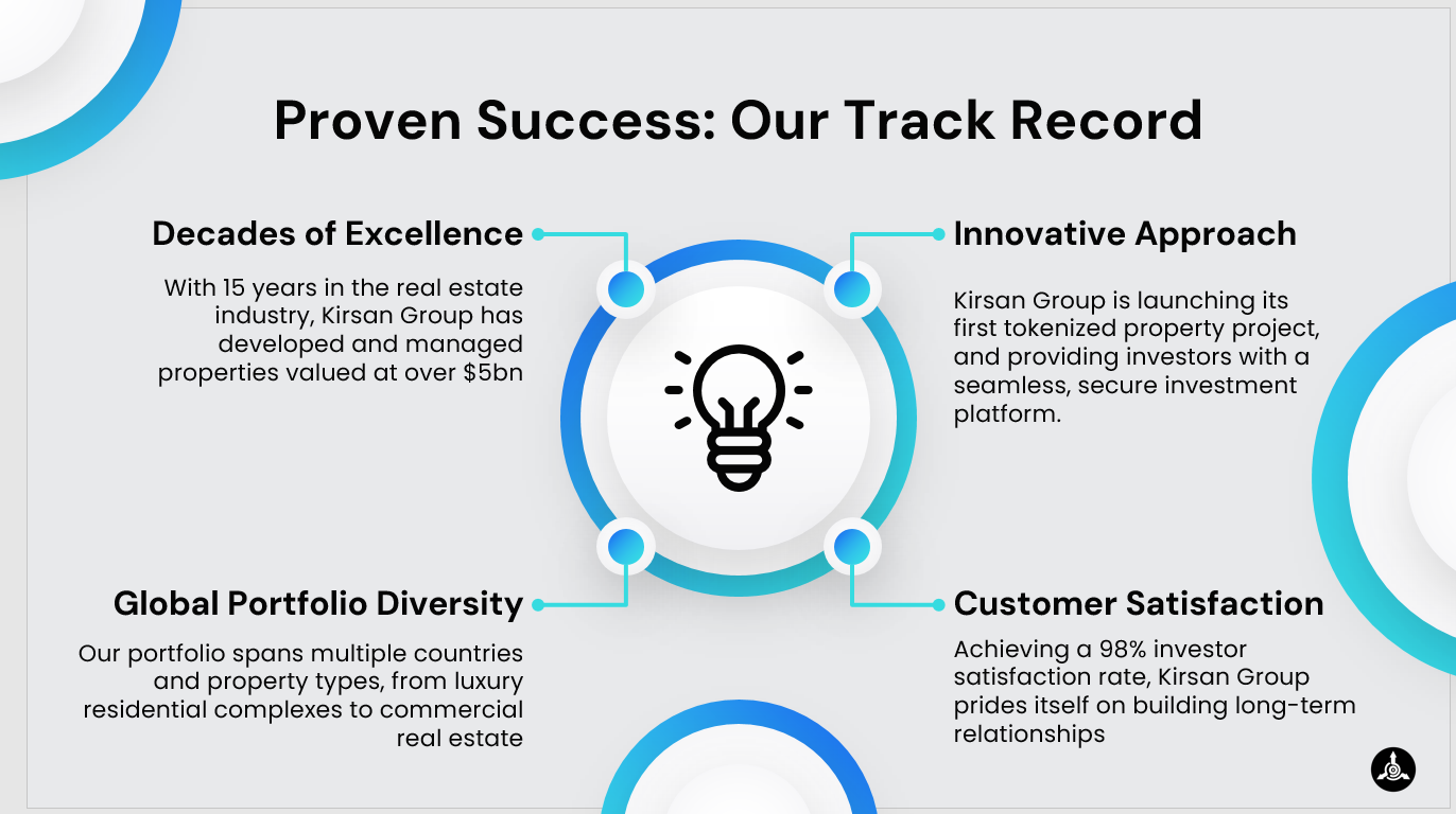 We ID and acquire high-potential real estate assets, leveraging our expertise to select properties that promise robust returns. Each property is then tokenized, transforming physical assets into digital shares, accessible to a broad investor base. We engage with investors, helping them by investing into share capital. This way, they will get dividends as company will generate fees 5-7% from each tokenized project on the platform.